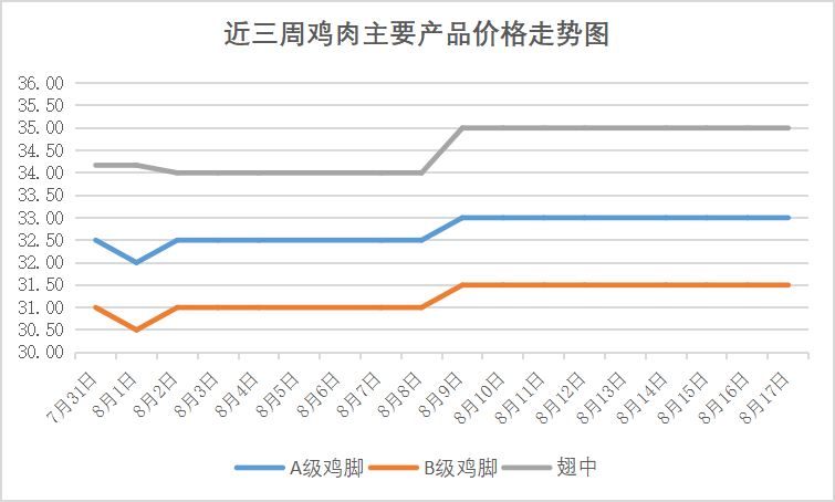 本周进口鸡肉市场价格整体平稳,基本与上周持平。有行业专家认为,暑期出游旺季带动了禽肉户外消费,鸡肉价格有望依然整体呈现上涨趋势。立秋后,自北向南气温逐步回落,东北地区天气转凉,家庭鸡肉消费需求将逐步改善,鸡肉购销将持续增加。