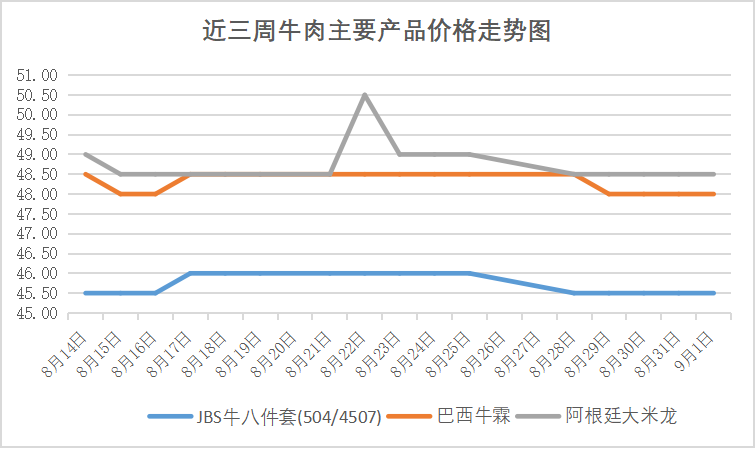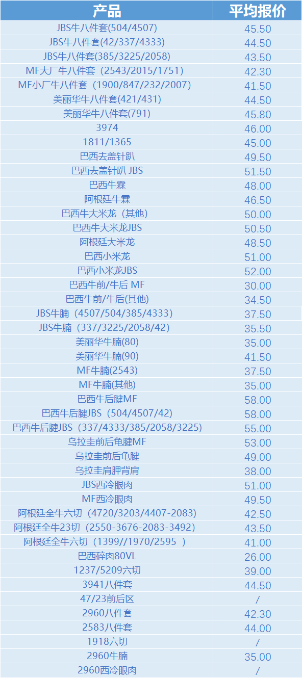 现货价格整体呈下跌趋势,巴西价格波动较明显,其中JBS牛八件套(504/4507)、JBS牛腩(337/3225/2058/42)、巴西牛霖等单品部位价格均下跌0.5元/公斤左右。