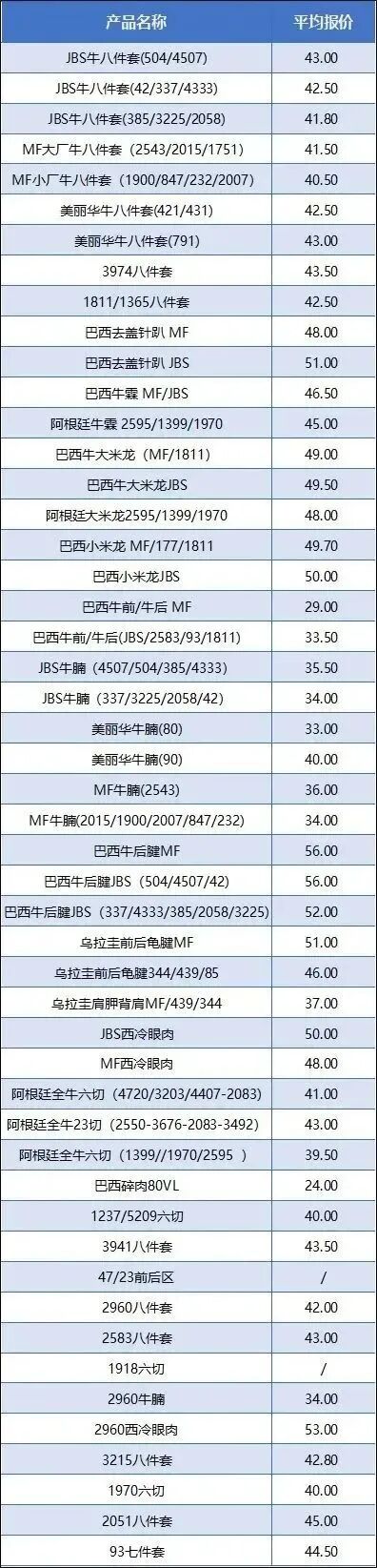 现货市场价格整体延续下跌趋势,多数部位均出现0.5元-1元/公斤左右跌幅,如巴西去盖针趴MF从49元/公斤跌至48元/公斤,巴西牛霖MF/JBS从47元/公斤跌至46.5元/公斤,阿根大米龙从48.5元/公斤跌至48元/公斤。