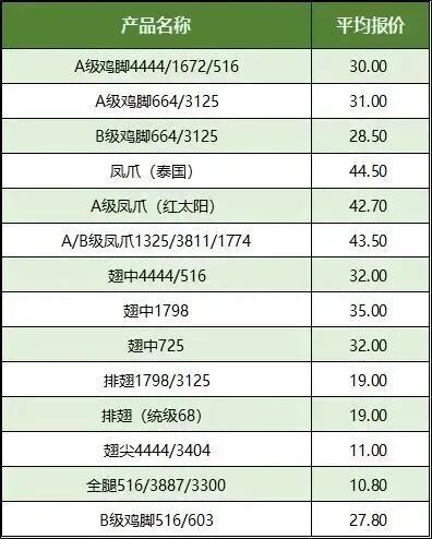 现货报价统计显示,进口鸡副类产品价格较上周整体小幅下跌。鸡脚平均下跌0.4元/公斤,凤爪类平均下跌0.7元/公斤,排翅类平均下跌1元/公斤。