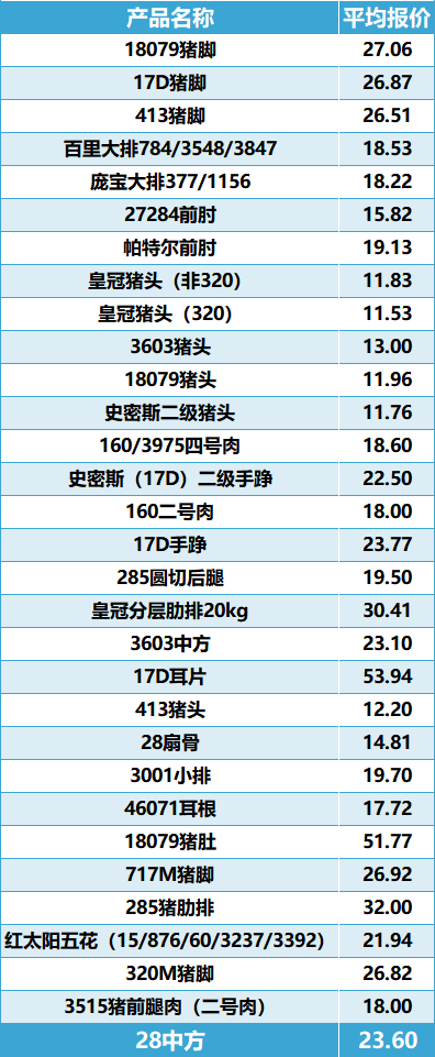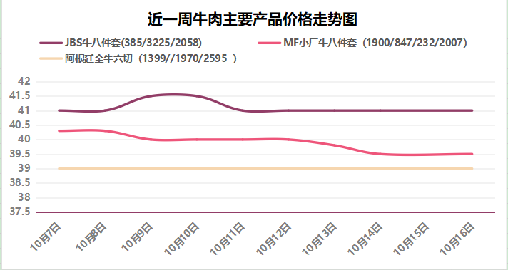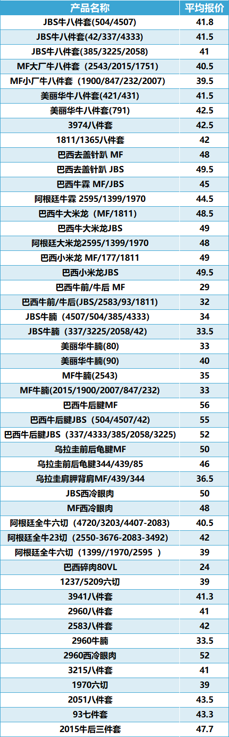 受节后市场需求释放不及预期影响,周内现货价格整体下行,多数部位均出现0.5-1元/公斤左右跌幅,相较之下 前部位肉跌幅更明显。本周如前8件套整体报价多在39.5-41.5元/公斤,主流多在41元/公斤, 节前多在40.5-43.5元/公斤,主流多在42元/公斤;阿根廷全牛6切价格比较平稳,维持在39元/公斤, 节前多在40-42元/公斤,主流在41元/公斤。