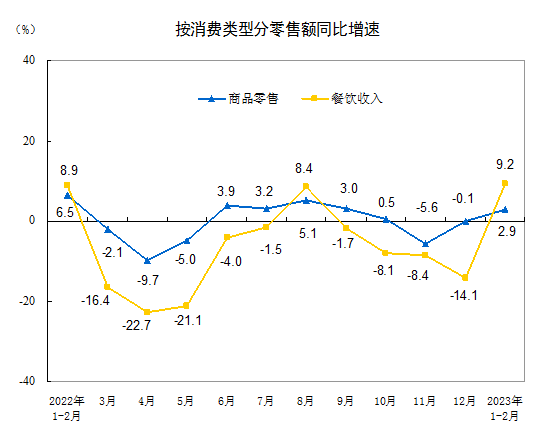 国家统计局发布的数据显示,1-2月份,社会消费品零售总额77067亿元,同比增长3.5%,市场销售由降转增。按消费类型分,1—2月份,商品零售68638亿元,同比增长2.9%;餐饮收入8429亿元,增长9.2%。