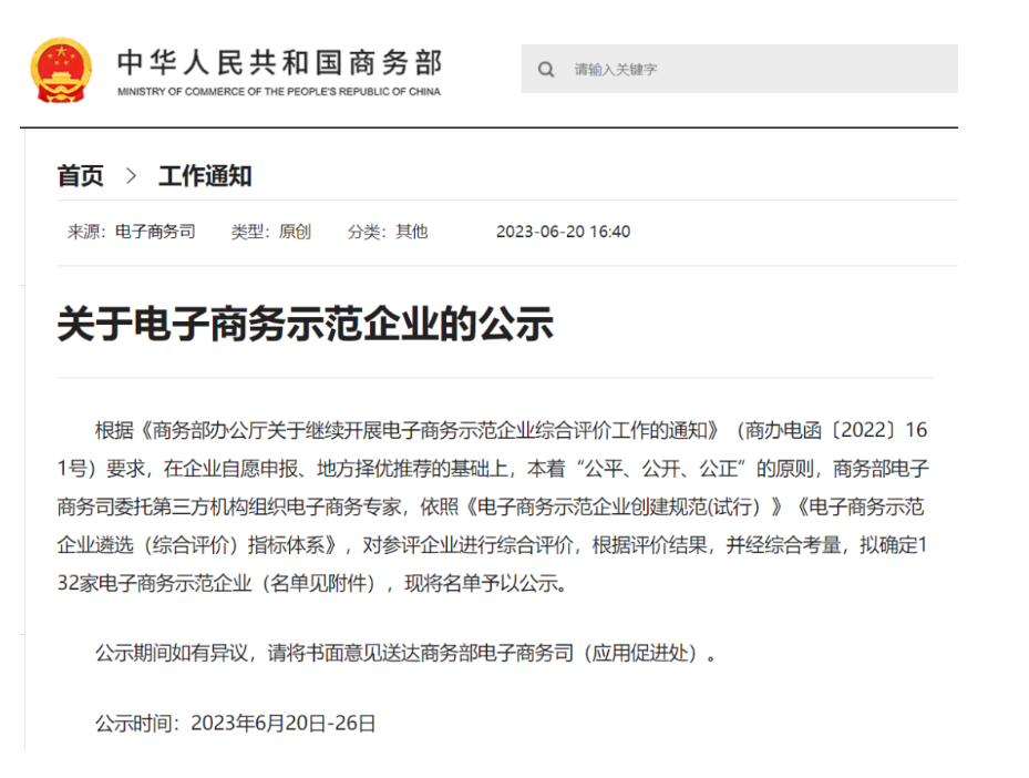 据了解,根据《商务部办公厅关于继续开展电子商务示范企业综合评价工作的通知》(商办电函〔2022〕161号)要求,在企业自愿申报、地方择优推荐的基础上,本着“公平、公开、公正”的原则,商务部电子商务司委托第三方机构组织电子商务专家,依照《电子商务示范企业创建规范(试行)》《电子商务示范企业遴选(综合评价)指标体系》,对参评企业进行综合评价,根据评价结果,并经综合考量,拟确定132家电子商务示范企业。