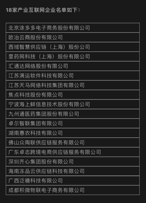 在这些上榜的企业中,有8家为产业互联网上市公司,包括国联股份旗下的涂多多、1药网、汇通达、满帮集团、焦点科技、九州通、卓尔智联、齐心集团。此外,一些赛道的头部企业也进入示范企业名单,如欧冶云商、天马网络以及积微物联等。