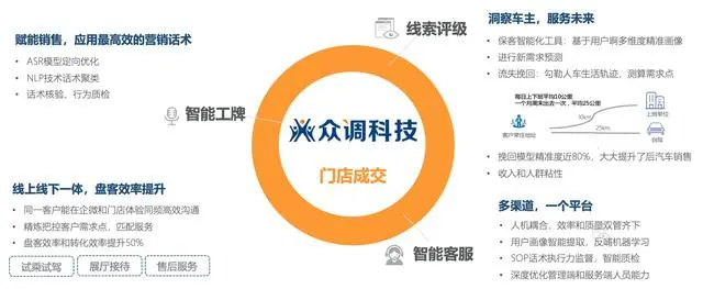 众调科技成立于2015年,先后获得上海市高新企业、上海市专精特新企业、上海市科技小巨人企业等称号。作为国内汽车产业全链路数智升级的引领者,公司凭借着核心产品矩阵——数智中台、成交引擎以及直售引擎,构建了“一个大脑,两个引擎”的汽车全链路数智赋能矩阵。其中一个大脑集成了“四大数据中台及一套模型算法AI平台”,最终形成底层核心数据中台(用户数据中台CDP+车联数据中台VDP+网络数据中台NDP和内容数据中台MDP) + AI大模型(众调·擎天大模型和企业开放AI平台) + 应用层高效工具(成交引擎+直售引擎—赋能门店的系列数智化工具,比如AI-DCC和智慧工牌等)的PaaS+MaaS+SaaS的产品布局,全面赋能营销端、车机端和自动驾驶端,使得数据在行业内各个场景安全流转的过程中创造丰富价值,从而提升效率与产业效能。